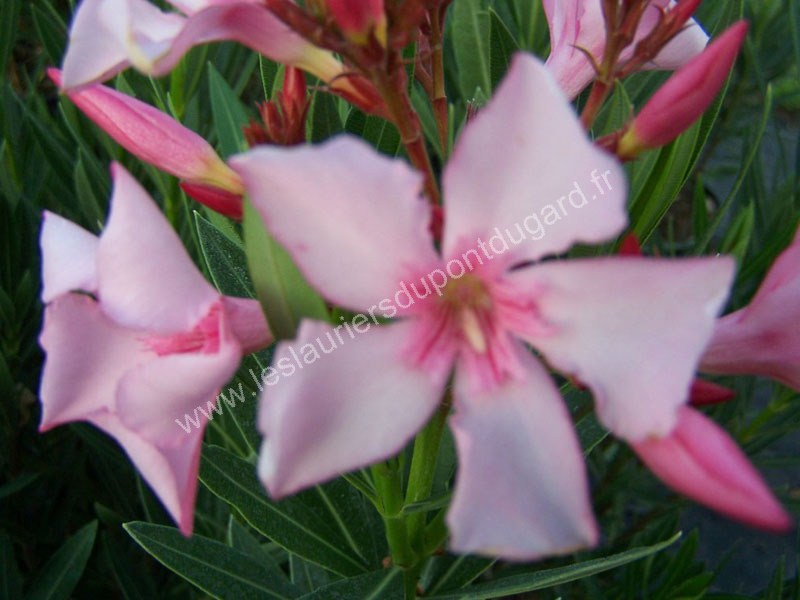 Laurier au port vigoureux, bois raide, pousse lente, florifère. Taille adulte: environ 3 mètres Résistance au froid: 5/5 Feuille moyenne, trapue Fleur simple, diamètre 5 à 6 cm, pétales bien écartés, forme en étoile, bouton fin et pointu Couleur: rose clair avec le coeur un peu plus vif, bouton légèrement plus foncé Légèrement parfumé A planter en massif, isolé ou en haie |